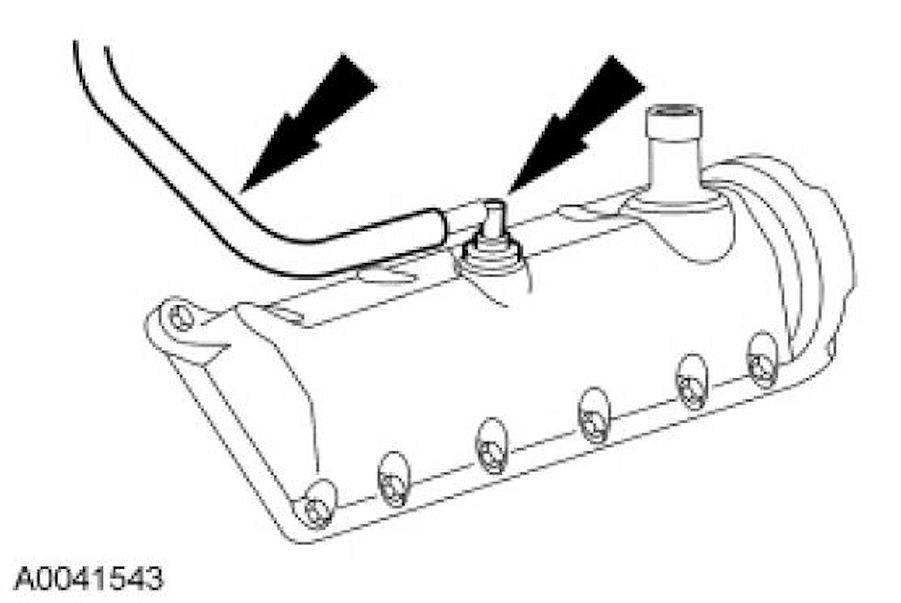 55. Install the crankcase ventilation tube on the LH valve cover.