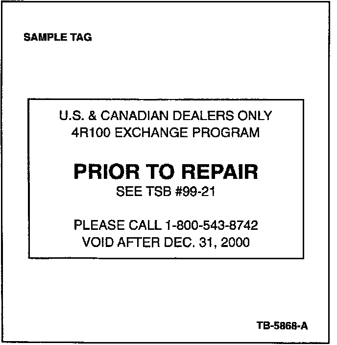Prior to December 31, 2000, do not disassemble or repair these orange tagged 4R100 transmissions. Perform the following diagnostic steps, record your findings, and contact Ford Motor Company at 1-800-543-8742. Refer to the following Service Procedure for details.