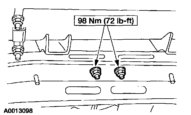 6. Remove the two bolts retaining the heat shield to the transmission support crossmember bolts.