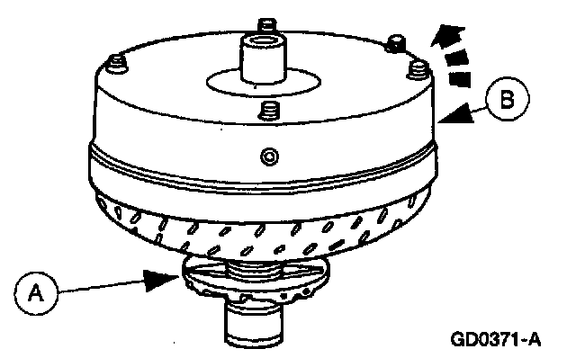 2. Mount (A) torque converter on the (B) front pump support with the splines on the one-way clutch inner race, engaging the mating splines of the front pump support.