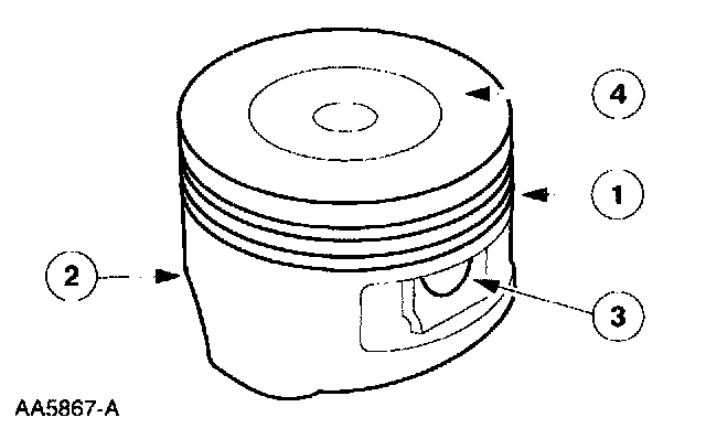 1. Clean and inspect the (1) ring lands, (2) skirts, (3) pin bosses, and the (4) tops of the pistons. If wear marks, scores or glazing is found on the piston skirt, check for a bent or twisted connecting rod.