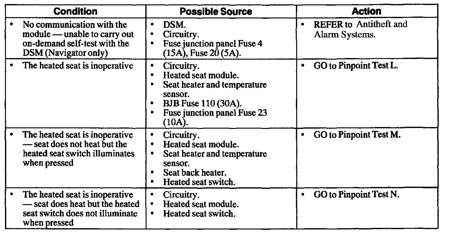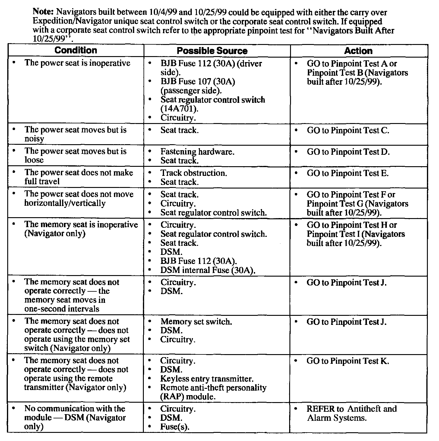 NOTE: Navigators built between 10/4/99 and 10/25/99 could be equipped with either the carry over Expedition/Navigator unique seat control switch or the corporate seat control switch.If equipped with a corporate seat control switch refer to the appropriate pinpoint test for "Navigators Built After 10/25/99".