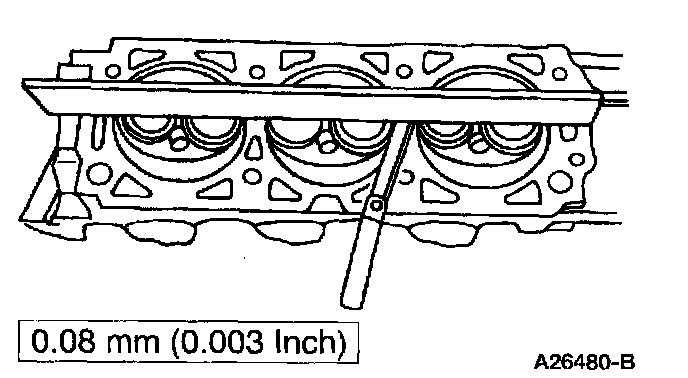 Use a straightedge and a feeler gauge to inspect the cylinder head for flatness. If the cylinder head is distorted, resurface the cylinder head within specification.