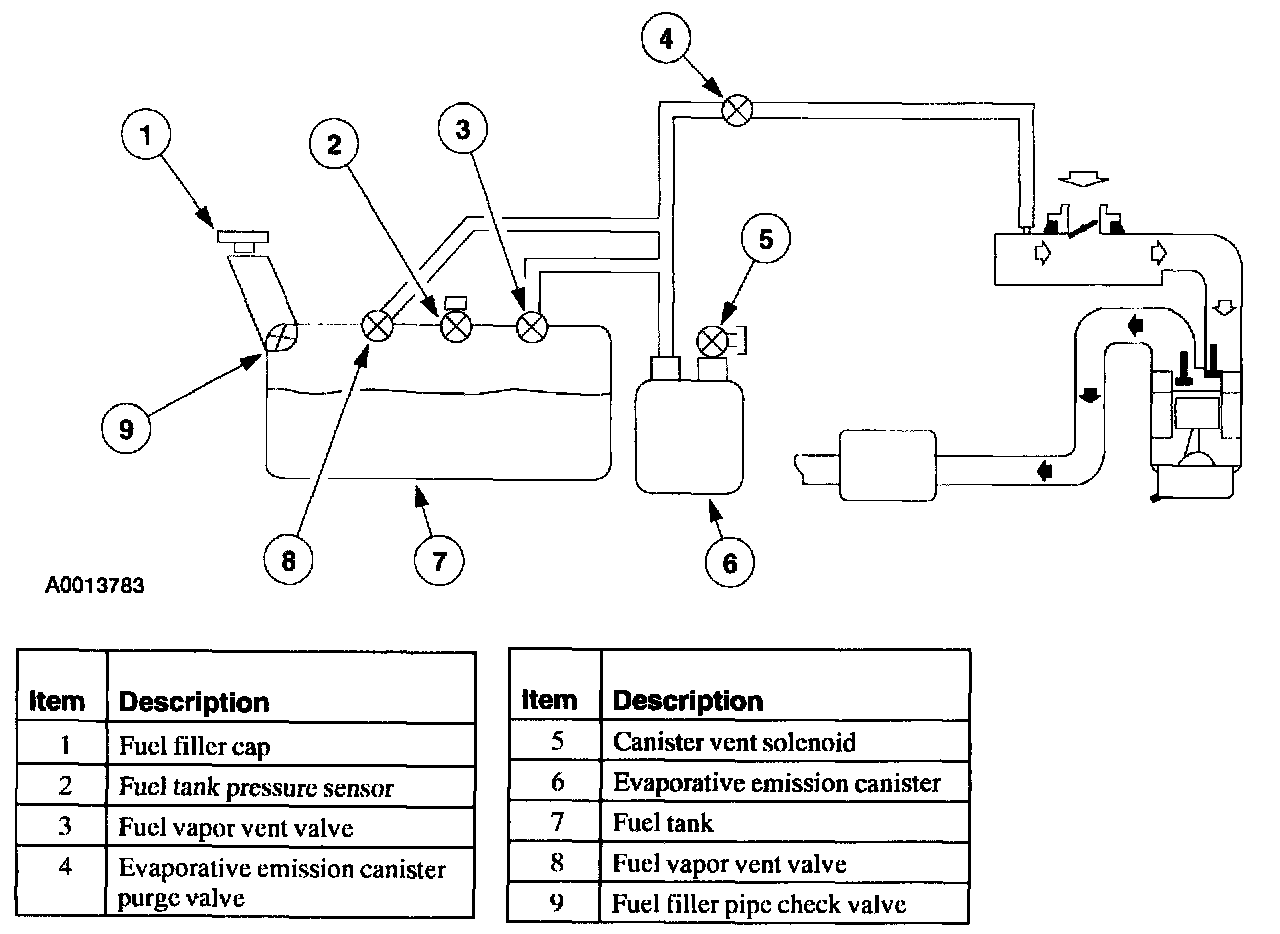 The Fuel Vapor Vent (FVV) valve assembly is mounted on the top of the fuel tank. It is used to control the flow of fuel vapors entering the EVAP system. The head portion of the assembly prevents the fuel tank from overfilling during refueling. The assembly also has a spring float, which prevents liquid fuel from entering the vapor delivery system under severe handling or vehicle rollover conditions. In the upright position the open bottom of the float will lift and shut off the orifice. Under severe handling conditions, the spring will push the float closed when angles allow liquid fuel to reach the orifice. In a rollover condition the weight of the open bottom float and spring pressure will close the orifice.