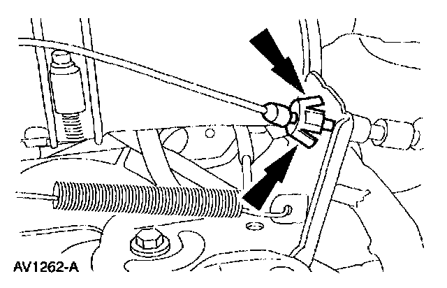 6. Depress the locking tabs and remove the accelerator cable from the accelerator cable bracket.