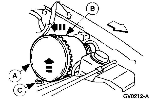 2. Lift the (B) open end of the (A) inlet air cleaner until free of the (C) air cleaner support insulators.