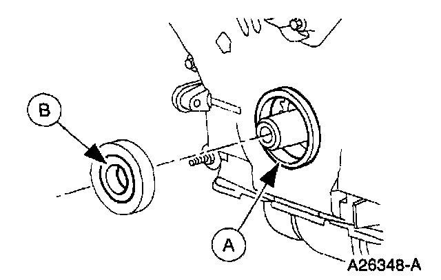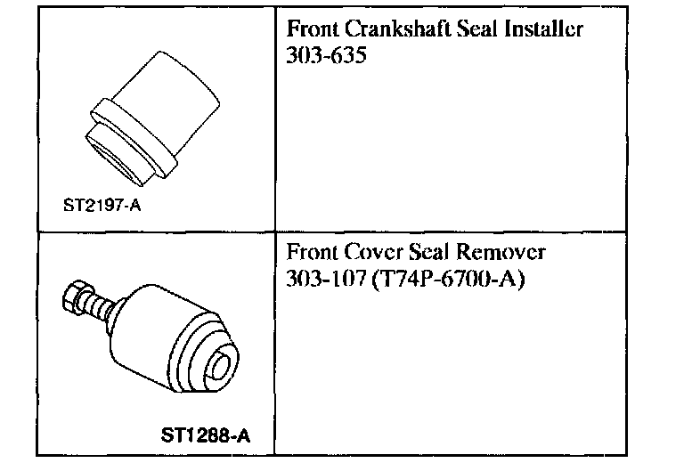 1. Lubricate the (A) and the (B) front oil seal inner lip. Use Super Premium SAE 5W-30 Motor Oil XO-5W30-QSP or equivalent meeting Ford specification WSS-M2C153-G.