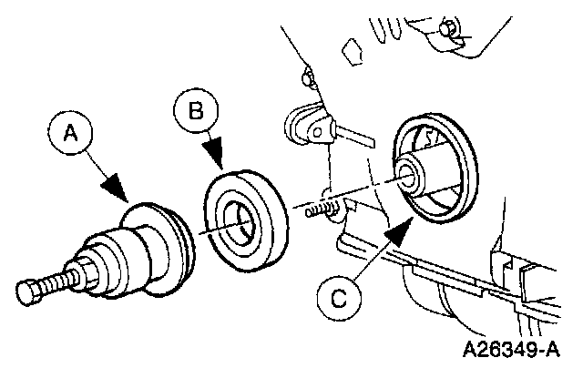 2. Use the (A) Crankshaft Seal Replacer/Cover Aligner to install the (B) front cover seal into the (C) engine front cover.