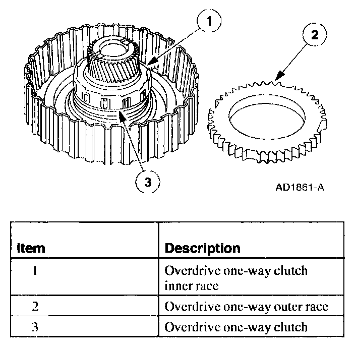 The following information describes the operation of the three 4R100 one-way clutches.One-Way Clutch-Overdrive