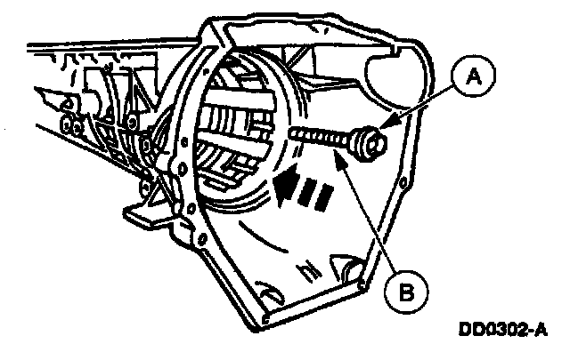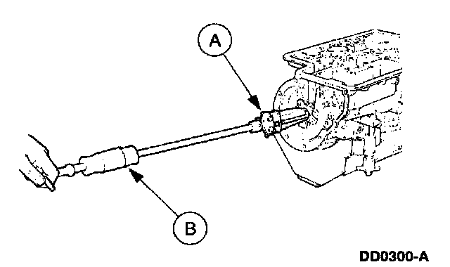 2. Place the other portion of the (A) Rear Case Bushing Replacer and the (B) 127 mm (5 inch) Threaded Drawbar through the case and into the front case bushing.