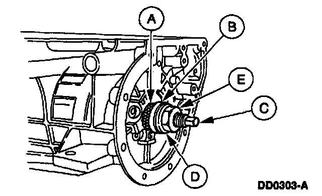 Place the (A) rear case bushing with the (B) Rear Case Bushing Replacer over the (C) 127 mm (5 inch) Threaded Drawbar and into the case. Install the (D) washer and the (E) nut hand-tight.