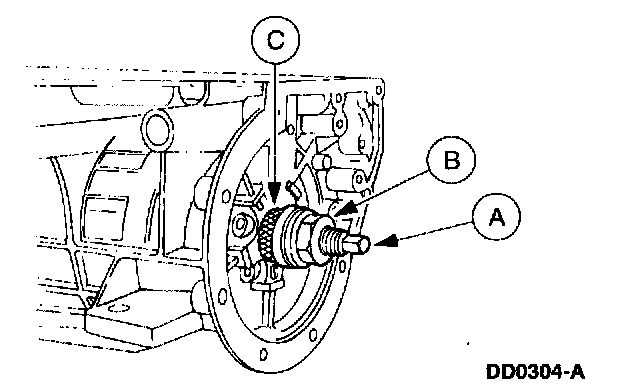 4. Hold the (A) drawbar with a 1/2 inch wrench while turning the (B) nut with a 1-1/8 inch wrench until the (C) rear case bushing is fully seated. Remove the tools.