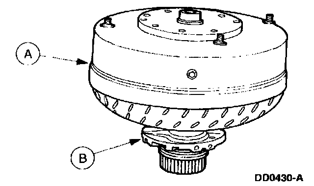2. Mount the (A) torque converter on the (B) stator support so that the splines on the one-way clutch inner race engage the mating splines of the stator support.