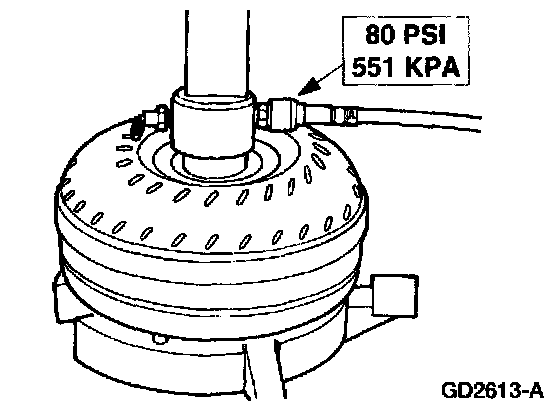 5. With air pressure applied to the valve, inspect for leaks at the converter hub, the seams and the studs. A soap bubble solution can be applied around those areas to aid in the diagnosis. If any leaks are present, replace the converter.