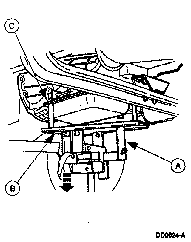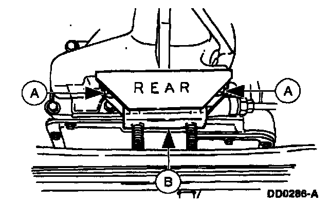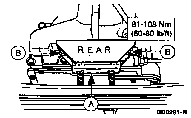 Raise the transmission jack until the (A) retainer studs are separated from the (B) transmission support crossmember.
