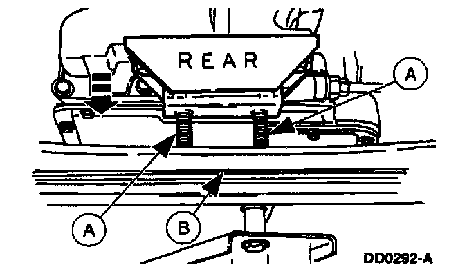 2. Lower the transmission jack while aligning the (A) retainer studs with the holes in the (B) transmission support crossmember. Allow the full weight of the transmission to rest on the transmission support crossmember
