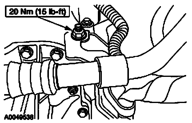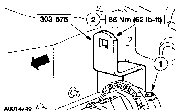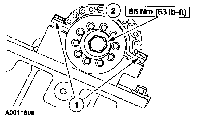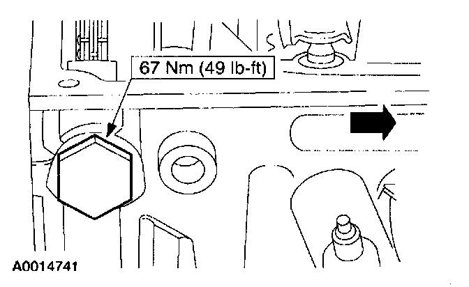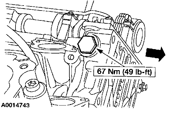 Note: When using a new washer the camshaft tensioner must be torqued to 44 Nm (32 lb-ft).
