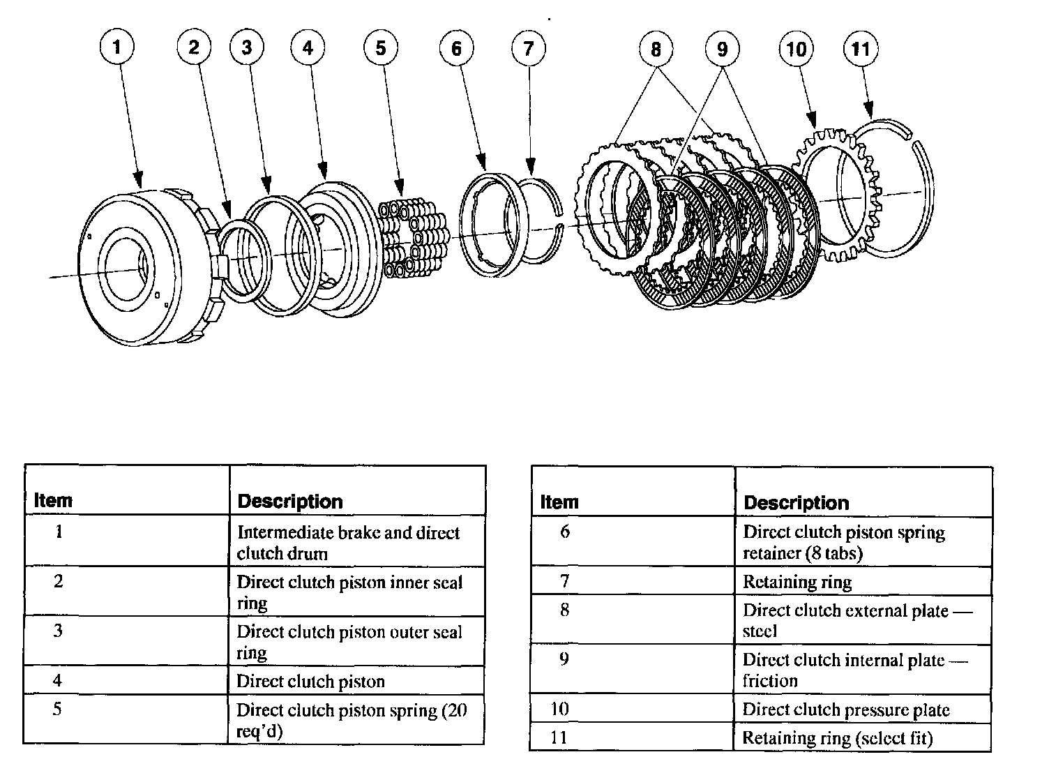 - The direct clutch is applied with hydraulic pressure and disengaged by return springs and the exhaust of the hydraulic pressure.