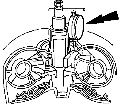 2. Attach Dial Indicator with Bracketry to End Play Checking Tool. Position the dial indicator bottom on the converter impeller housing and zero the dial.