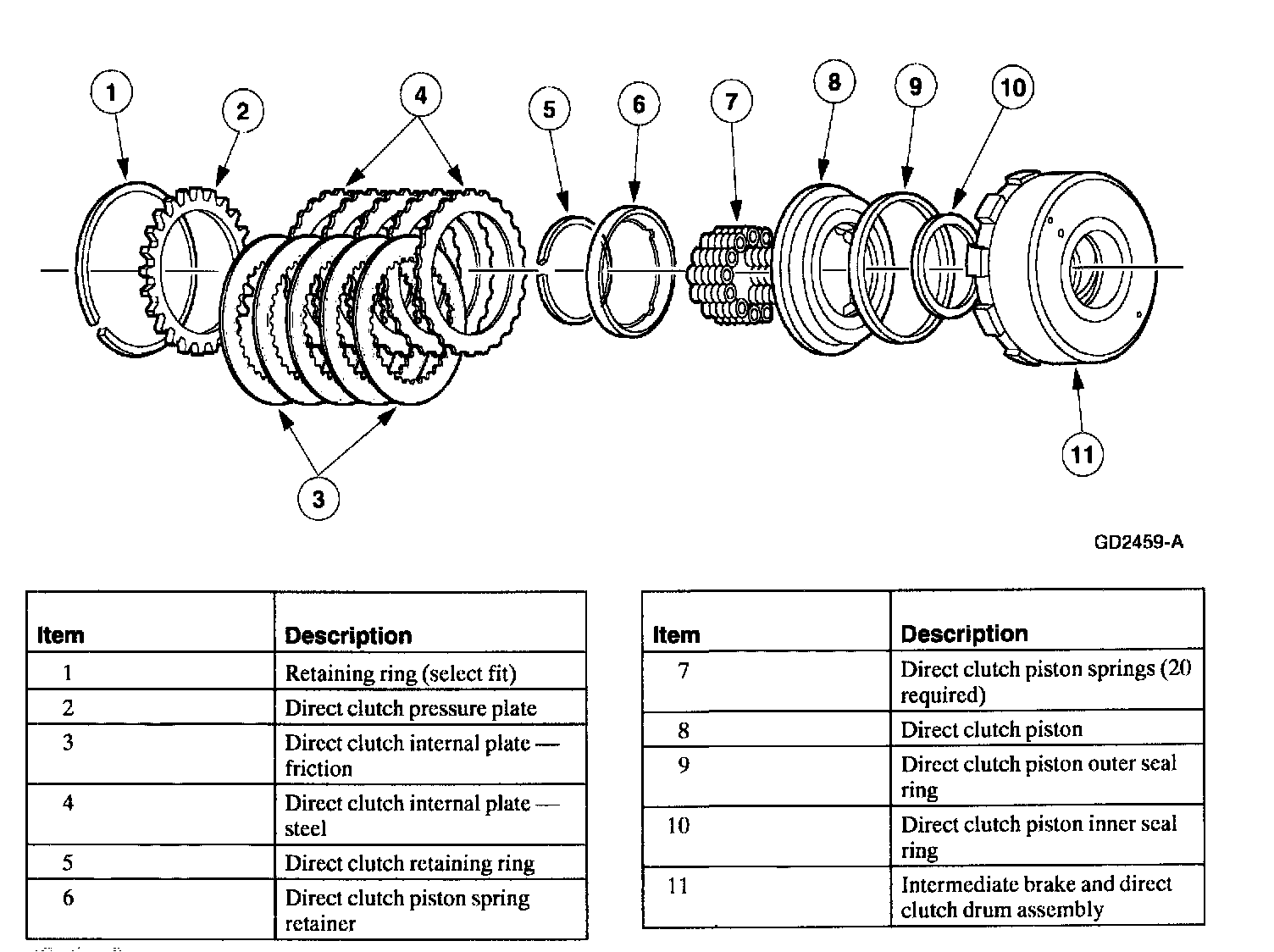 10. CAUTION: The direct clutch friction plates are directional and must be installed with grooves pointing clockwise (I.D. to O.D.) and the word COP) facing up.