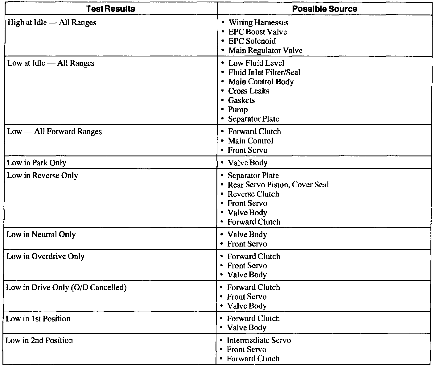 2. Start engine and check line pressures. Refer to the Line Pressure chart to determine if line pressure is within specifications.