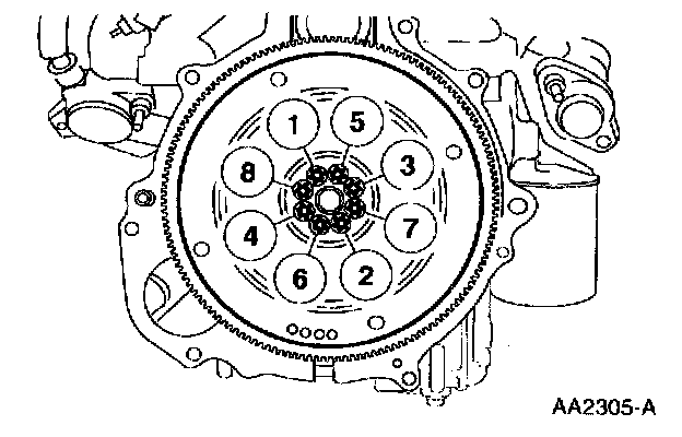2. Install the spacer, flywheel, and tighten the bolts in sequence in two steps: