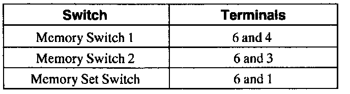 To check the memory set switch LED, connect the positive meter lead to terminal 8 and the negative lead to terminal 9. The meter should indicate greater than 0.3 volts. Reversing the leads, the meter should read OL.