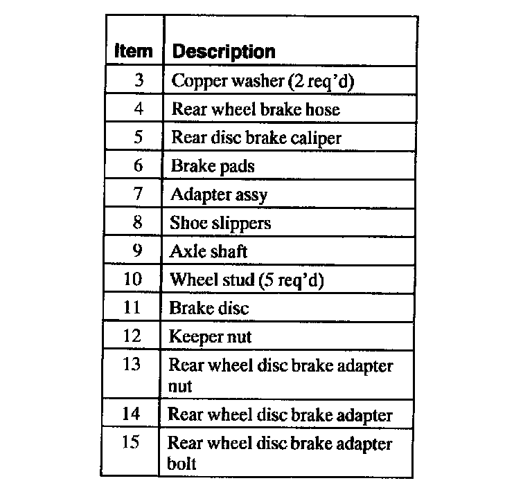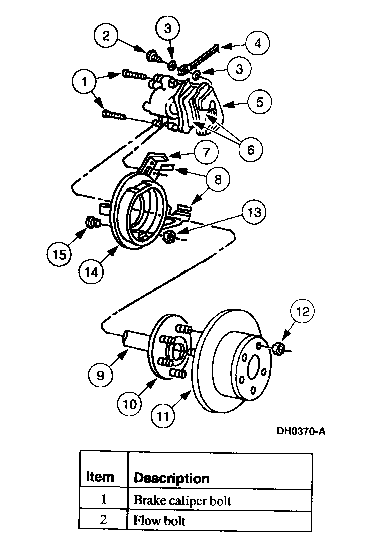 The brake disc is a solid, full-cast, drum-in-hat type. The rear disc brake caliper is equipped with a riveted spring clip that secures it to either the rear disc brake caliper piston or the rear disc brake caliper housing.