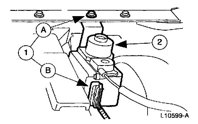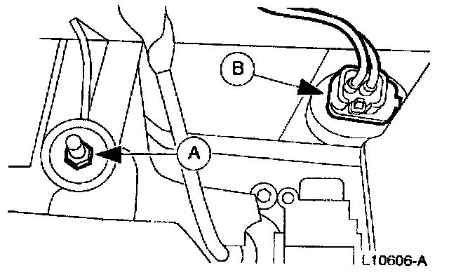 10. Disconnect the (B) A/C system vacuum harness and the (A) A/C evaporator housing mounting nut inside the vehicle.