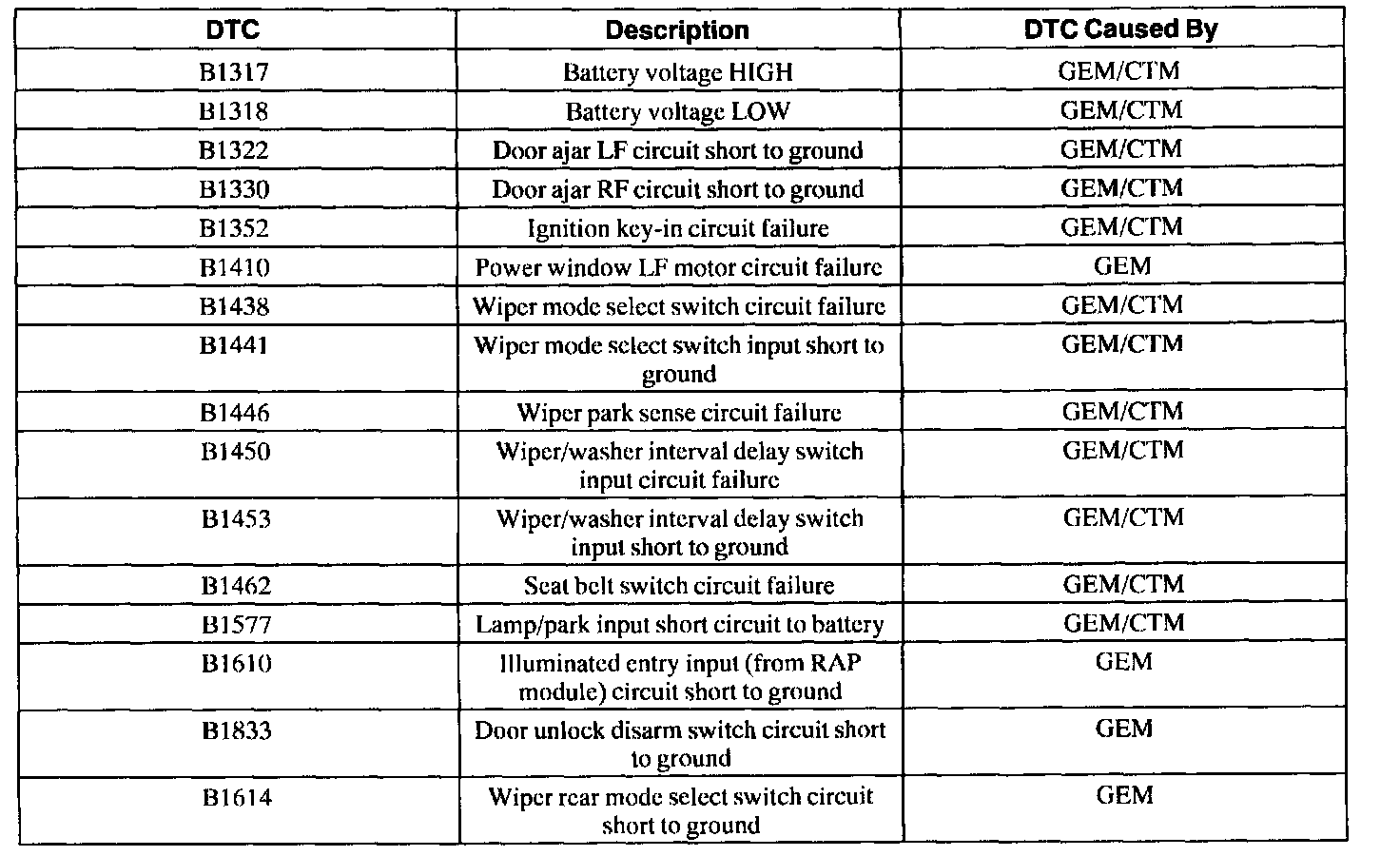 GEM/CTM Wiggle Test Diagnostic Trouble Code (DTC) Index