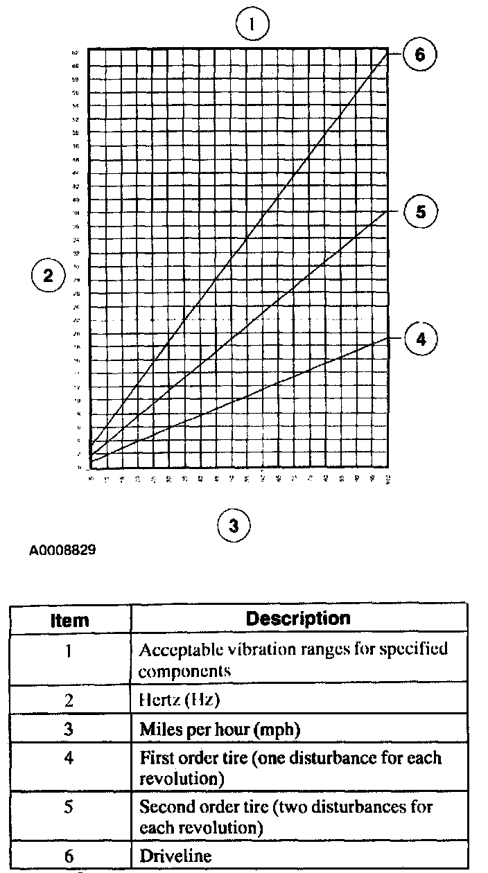 ^ Road test the vehicle at the speed where the vibration is most noticeable. Record the vibration frequency (rpm) and the engine rpm on the worksheet graph. The point on the graph where the vibration frequency (rpm) reading and the engine rpm reading intersect indicates the specific component group causing the concern.