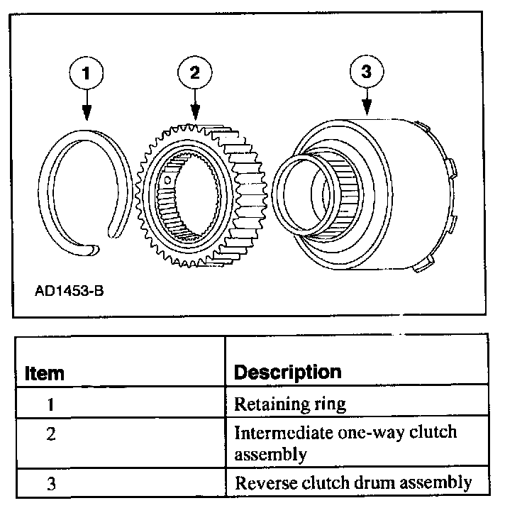 The intermediate one-way clutch works with the intermediate friction clutch to hold the reverse clutch drum and reverse sun gear stationary in second gear during acceleration. The intermediate one-way clutch freewheels in third gear and during coasting in second gear, (D) and D ranges.