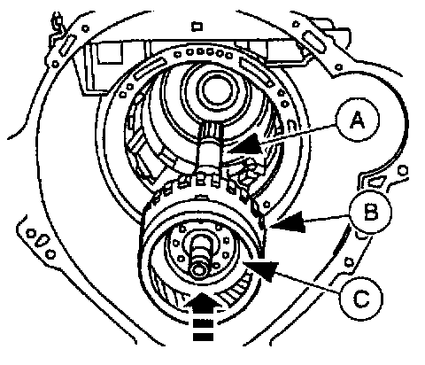 Install the (A) output shaft, (B) output shaft ring gear and the (C) direct clutch as an assembly.