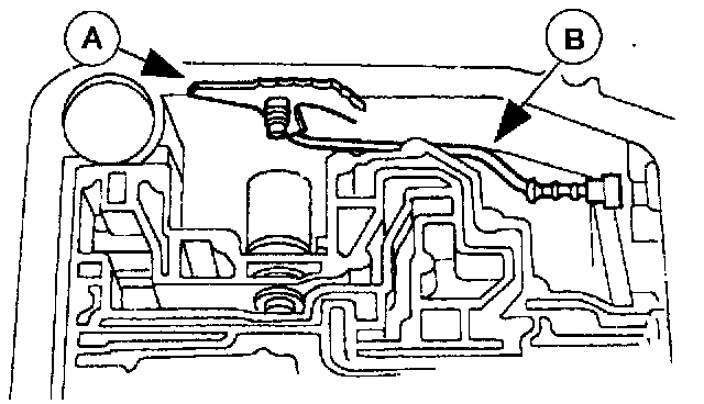 36. Install the (A) manual valve detent lever and (B) parking lever actuating rod.