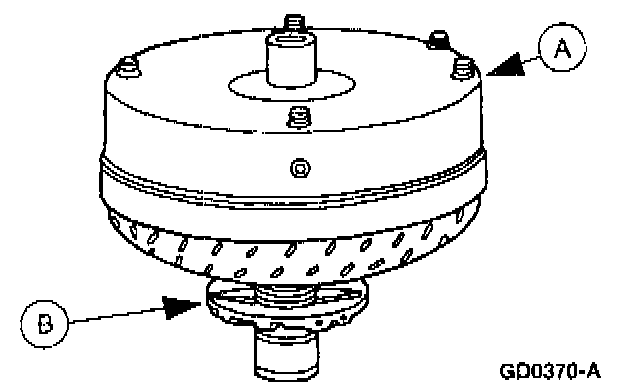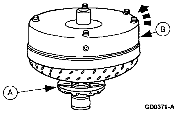 2. Mount (A) torque converter on the (B) front pump support with the splines on the one-way clutch inner race, engaging the mating splines of the front pump support.