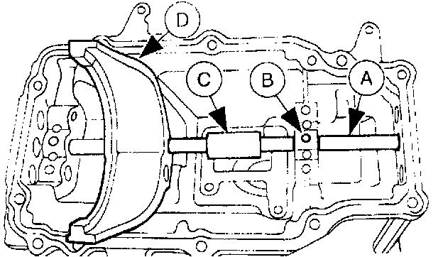 6. Position the (B) fifth/reverse shift control, the (C) detent ball and spring and the (D) shift gate and install the (A) fifth/reverse shift rail.