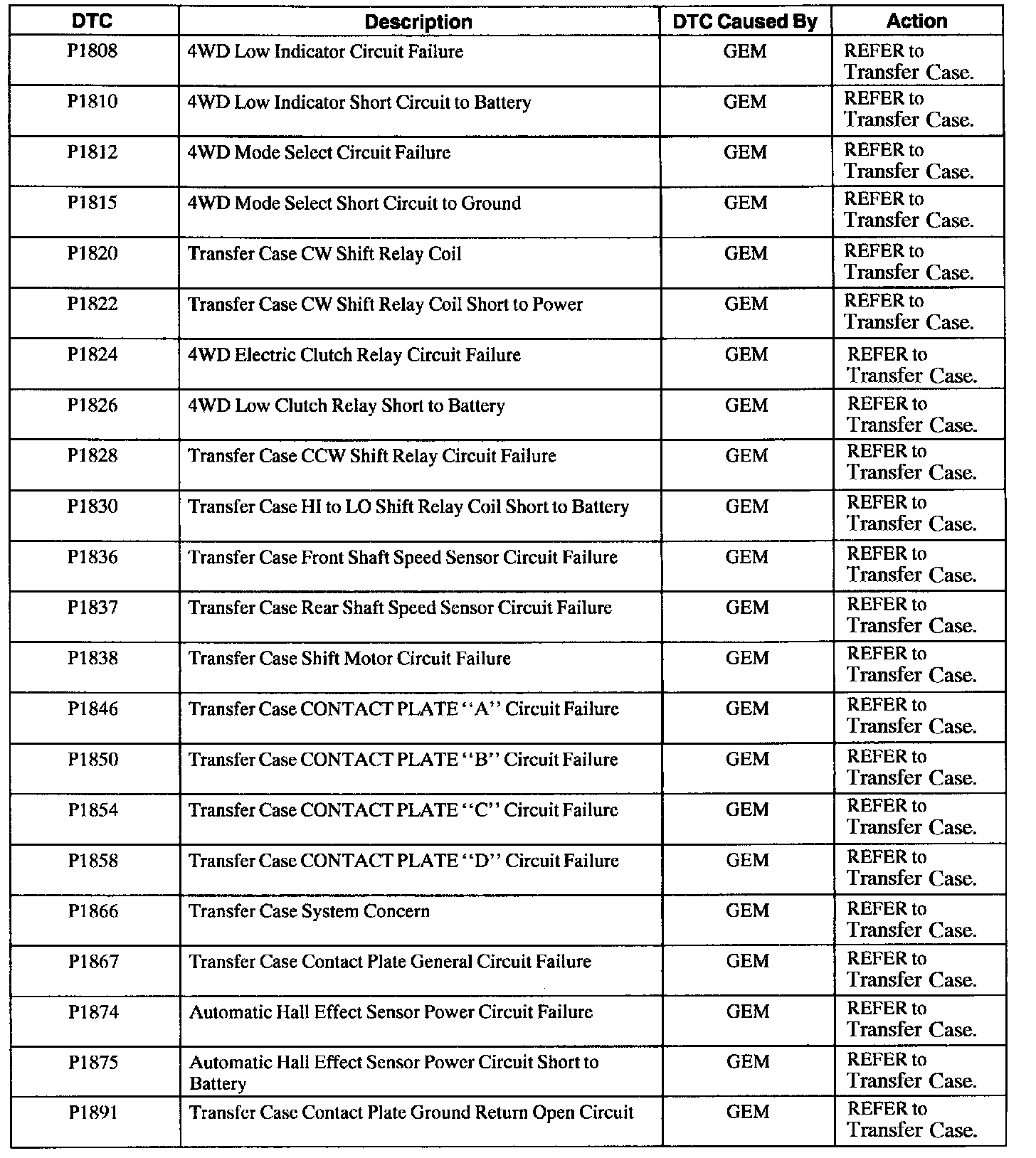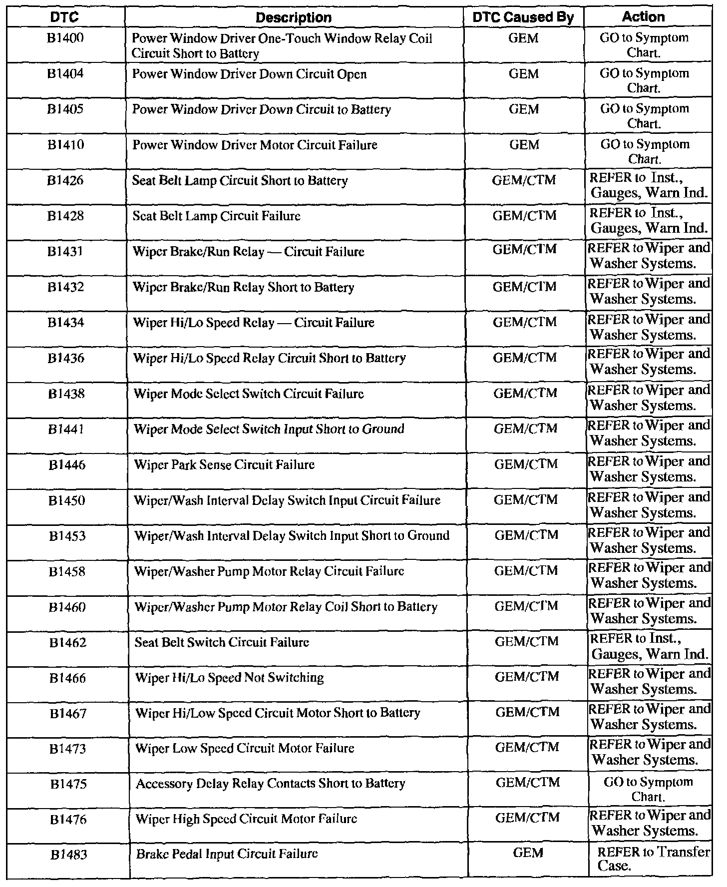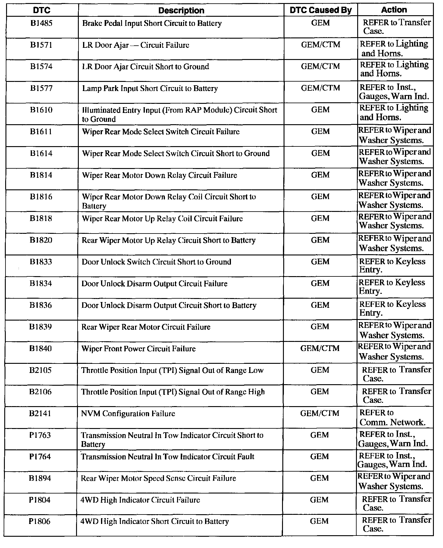 GEM/CTM Diagnostic Trouble Code (DTC) Index