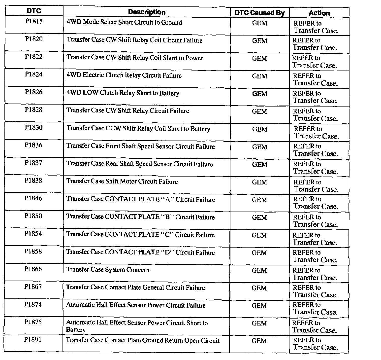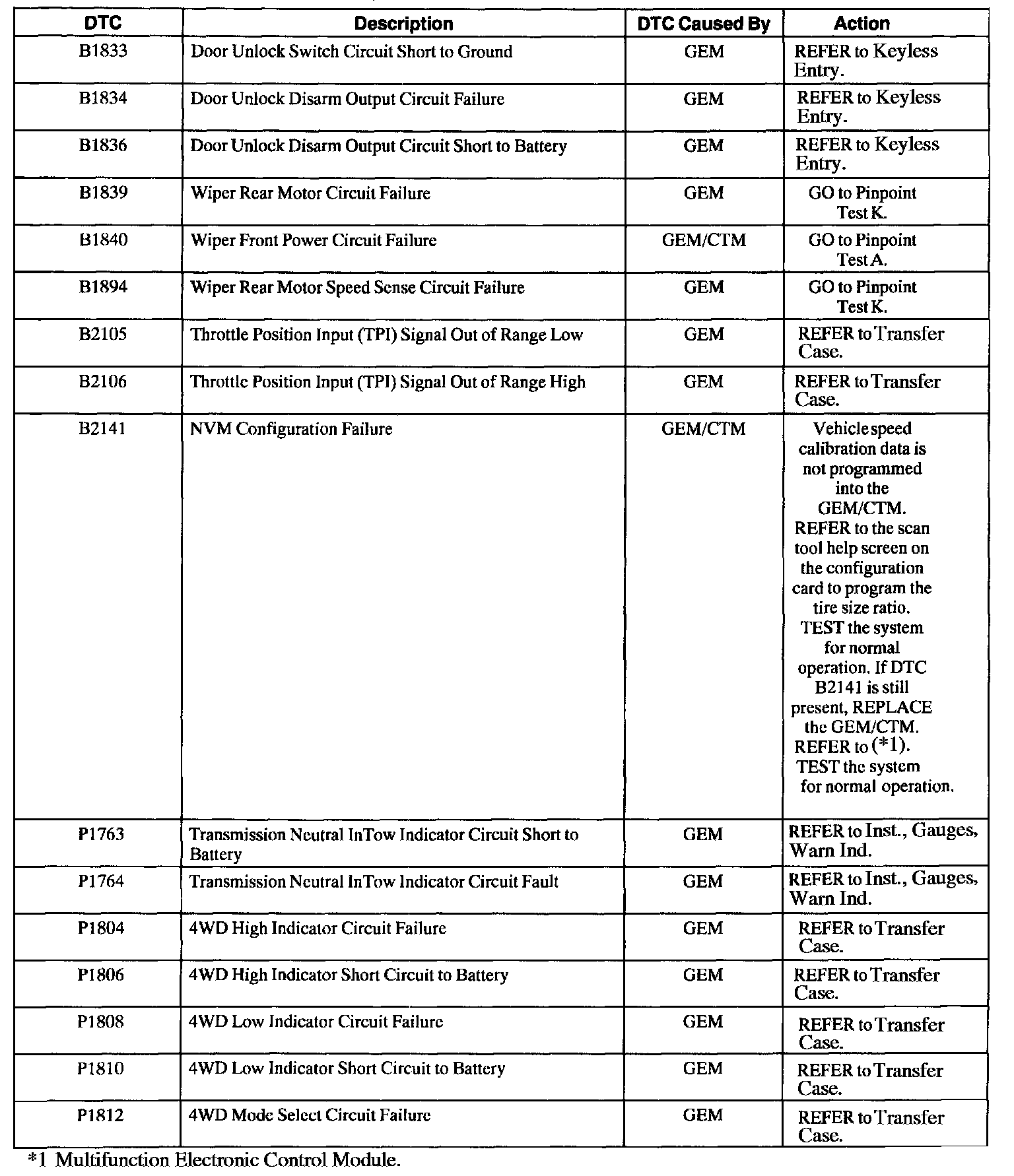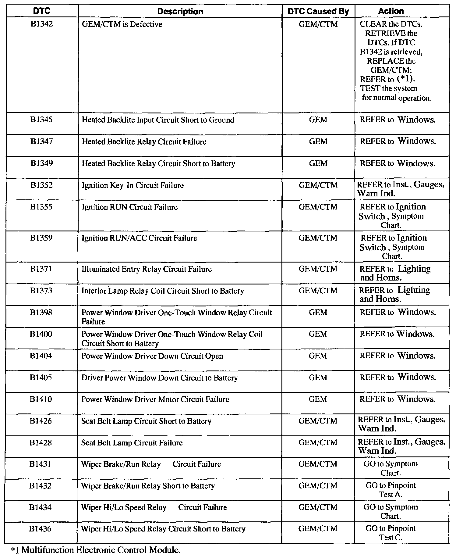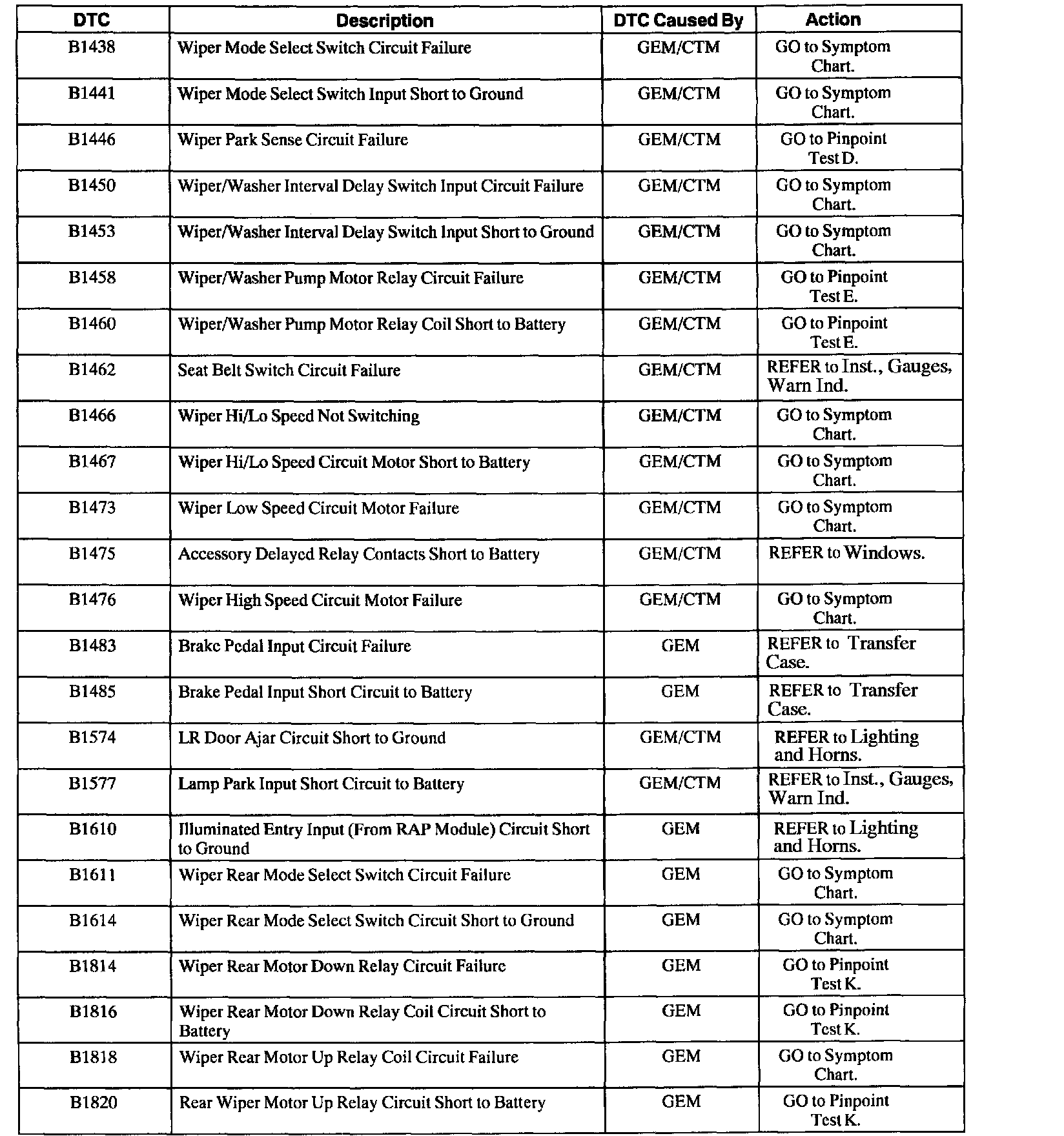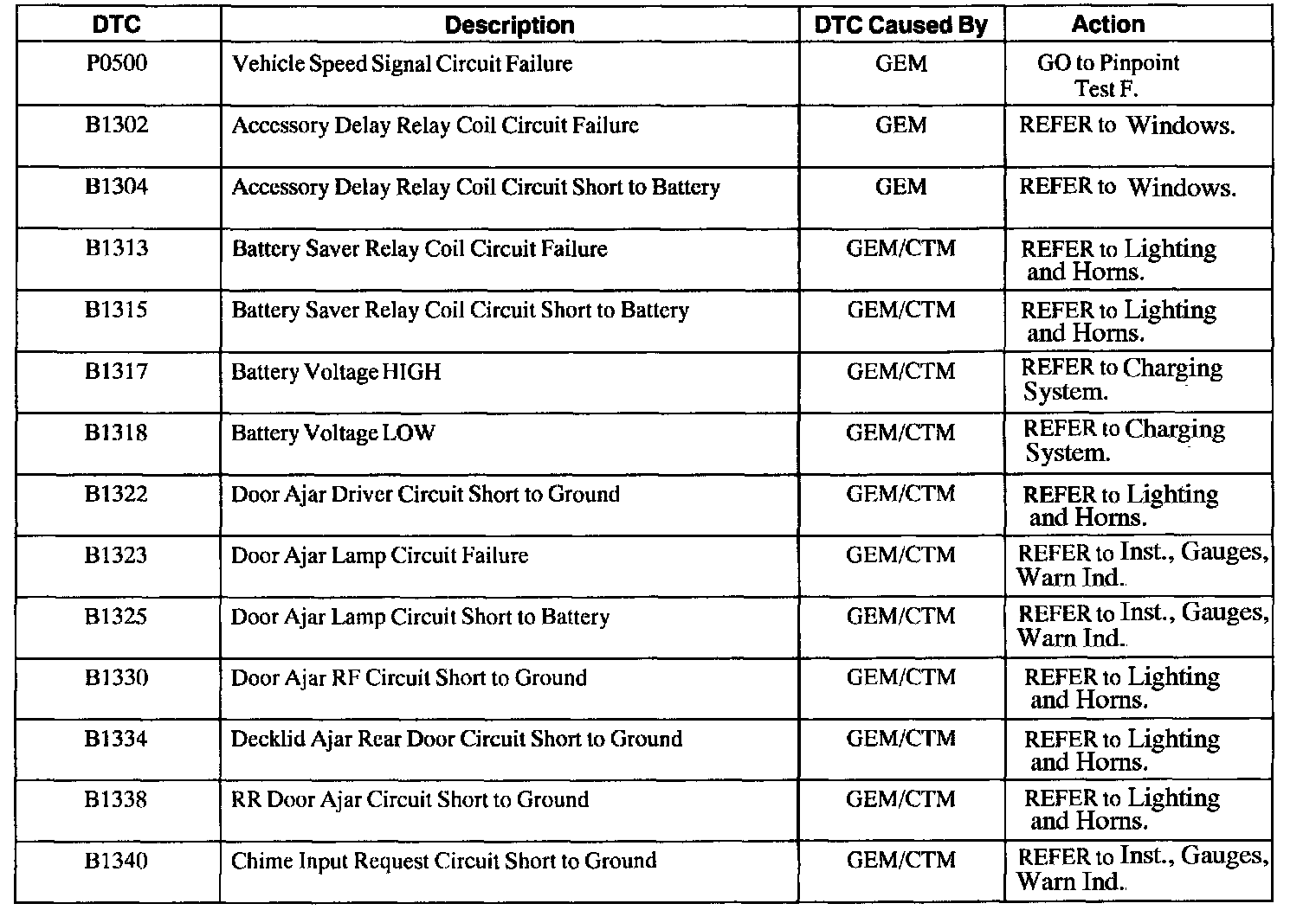 GEM/CTM Diagnostic Trouble Code (DTC) Index