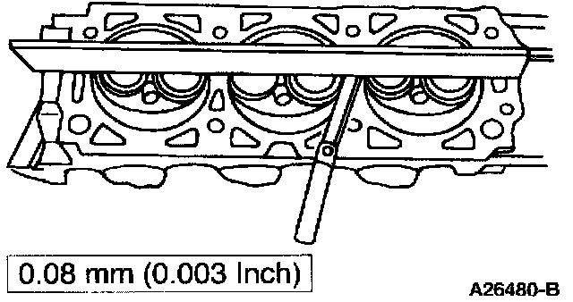 Use a straightedge and a feeler gauge to inspect the cylinder head for flatness. If the cylinder head is distorted, resurface the cylinder head within specification.