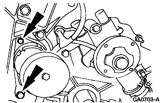 1. Remove the bolts and the drive belt tensioner.