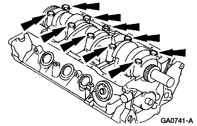 55. Remove the bolts and the five main bearing caps.