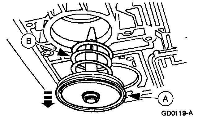 3. Remove the (A) overdrive servo piston and the (B) overdrive servo piston return spring.
