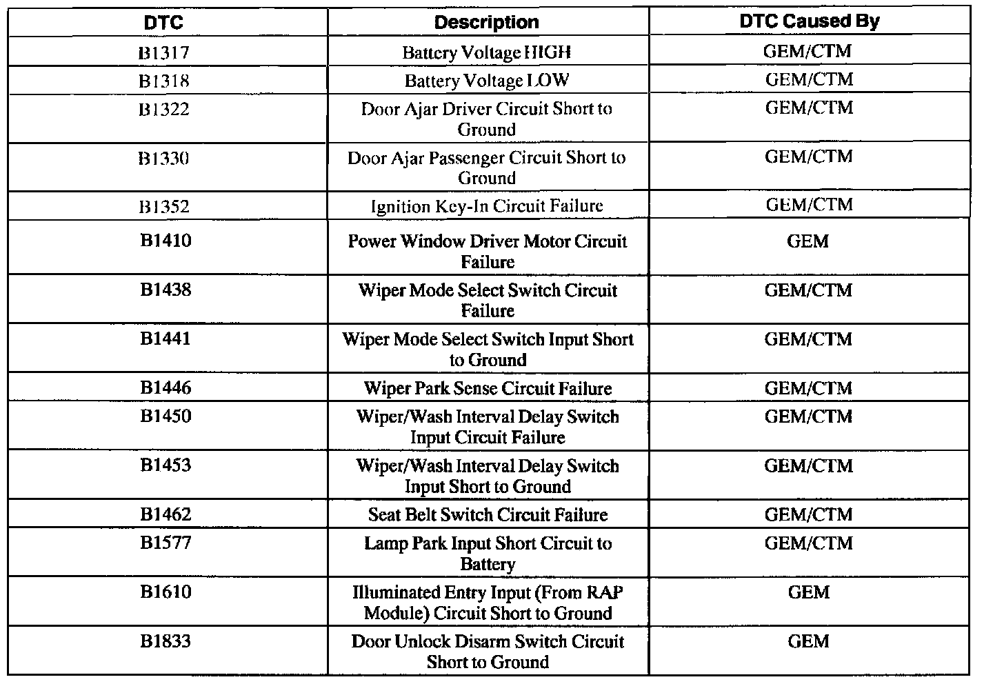 GEM/CTM Wiggle Test Diagnostic Trouble Code (DTC) Index