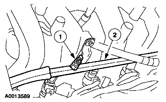 2. Remove the (1) fuel pressure relief valve from the (2) fuel injection supply manifold.