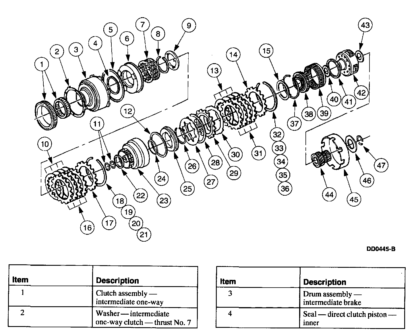 In second gear, the intermediate clutch assembly holds the forward/reverse sun gears. It is applied, along with the intermediate one-way clutch, to hold the intermediate brake drum, input shell and forward/reverse sun gear. In higher gears, the one-way clutch overruns.