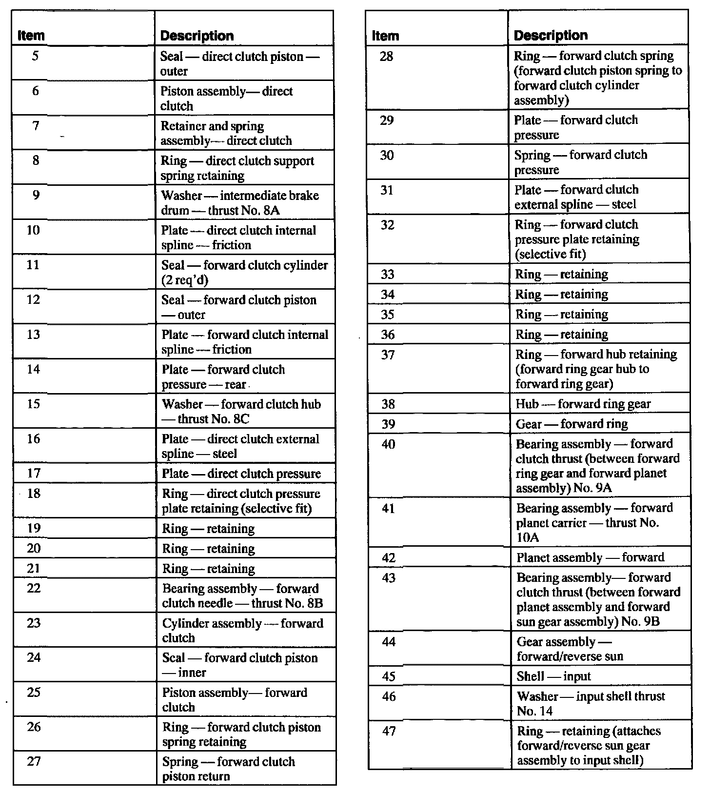 Two friction clutch assemblies, the direct clutch and the forward clutch, are shown with the forward planetary assembly. The direct clutch assembly splines the forward clutch cylinder to the intermediate brake drum. The forward clutch assembly splines the forward clutch cylinder to the forward ring gear. The forward clutch is activated during all forward gears. While in third or fourth gear, both the direct and forward clutches are applied to hold the forward planetary assembly and enable it to act as a solid shaft.