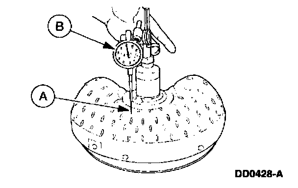 - Position the (A) indicator button between the ridges on the converter housing and zero the (B) dial.