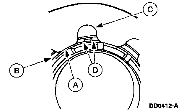 Install the forward clutch piston return spring, with the (A) spring fingers against the (B) forward clutch piston apply ring. Make sure the (C) notch is positioned so that both ends of the (D) forward clutch piston apply ring are visible.