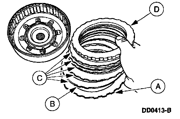 8. Install the (A) bottom forward clutch pressure plate with beveled face downward, the (B) forward clutch pressure spring, the (C) clutch pack, and the (D) top forward clutch pressure plate.