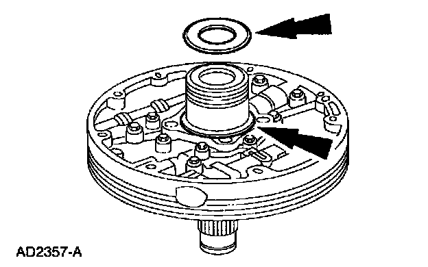 Install the 2 coast clutch Teflon seals. Make sure the seals are fully seated in the stator support seal grooves and the (D) seal ends are oriented 180° apart.